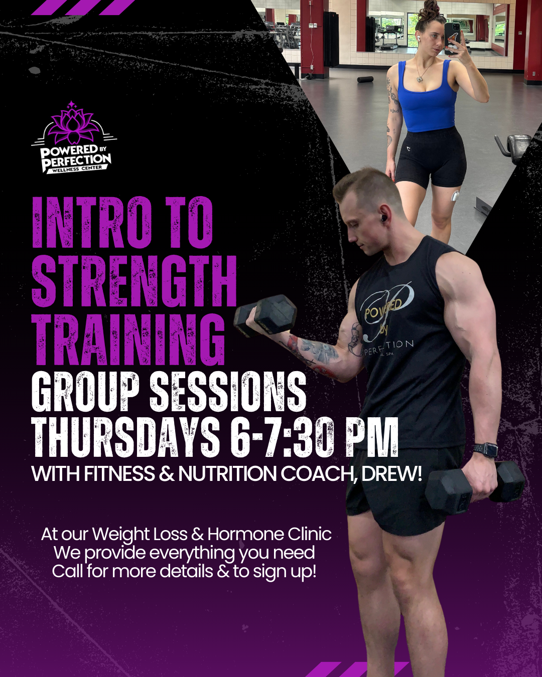 Interested in strength training but don’t know where to start? Join us for Intro to Strength Training Group Sessions with our Fitness & Nutrition Coach, Drew! These are held at our Powered by Perfection Weight Loss & Hormone Clinic on Thursdays from 6-7:30 PM. We provide everything you need- give us a call to sign up!